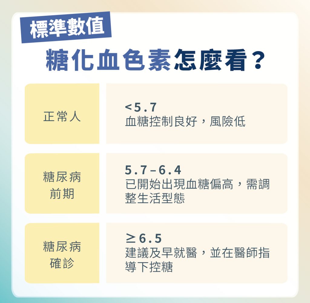 | 糖尿病前期 | 5.7–6.4 | 已開始出現血糖偏高,需調整生活型態 |