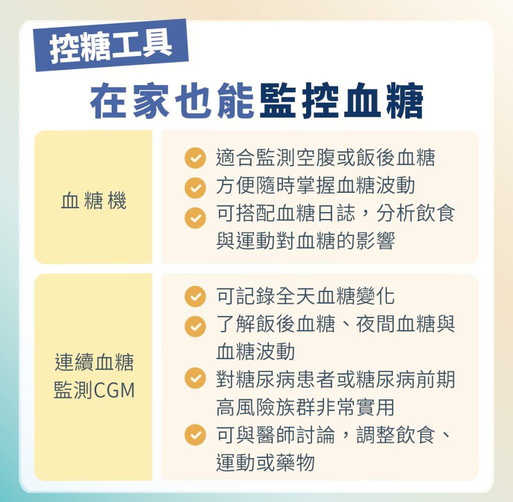 小建議:透過血糖機或 CGM 收集數據,對照自己的 HbA1c,可以了解血糖控制是否有效,並檢視生活習慣的調整成效。