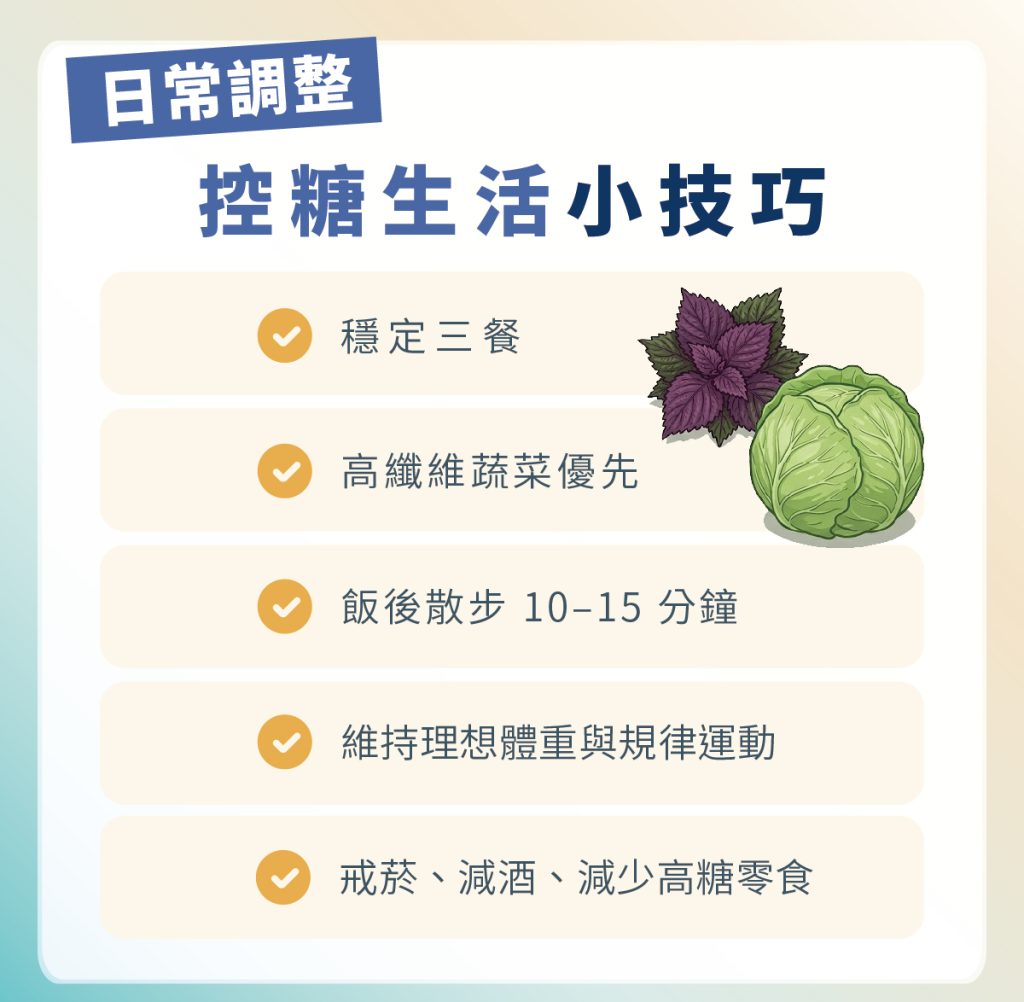 輕度運動可促進肌肉直接吸收血糖,減少胰島素負擔,即使只是室內踏步、上下樓梯或簡單伸展,也能幫助血糖更平穩。 - 維持理想體重與規律運動