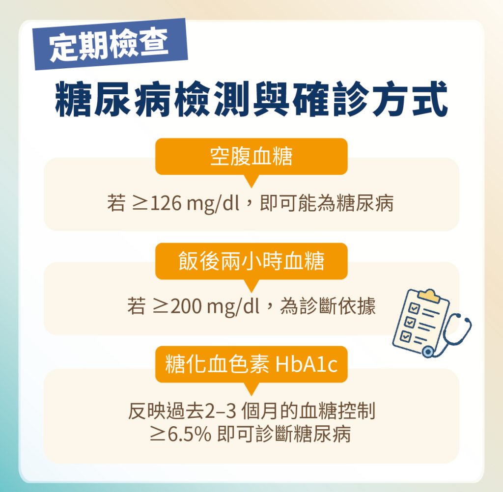 - HbA1c(糖化血色素):反映過去 2–3 個月的血糖控制,≥6.5% 即可診斷糖尿病。