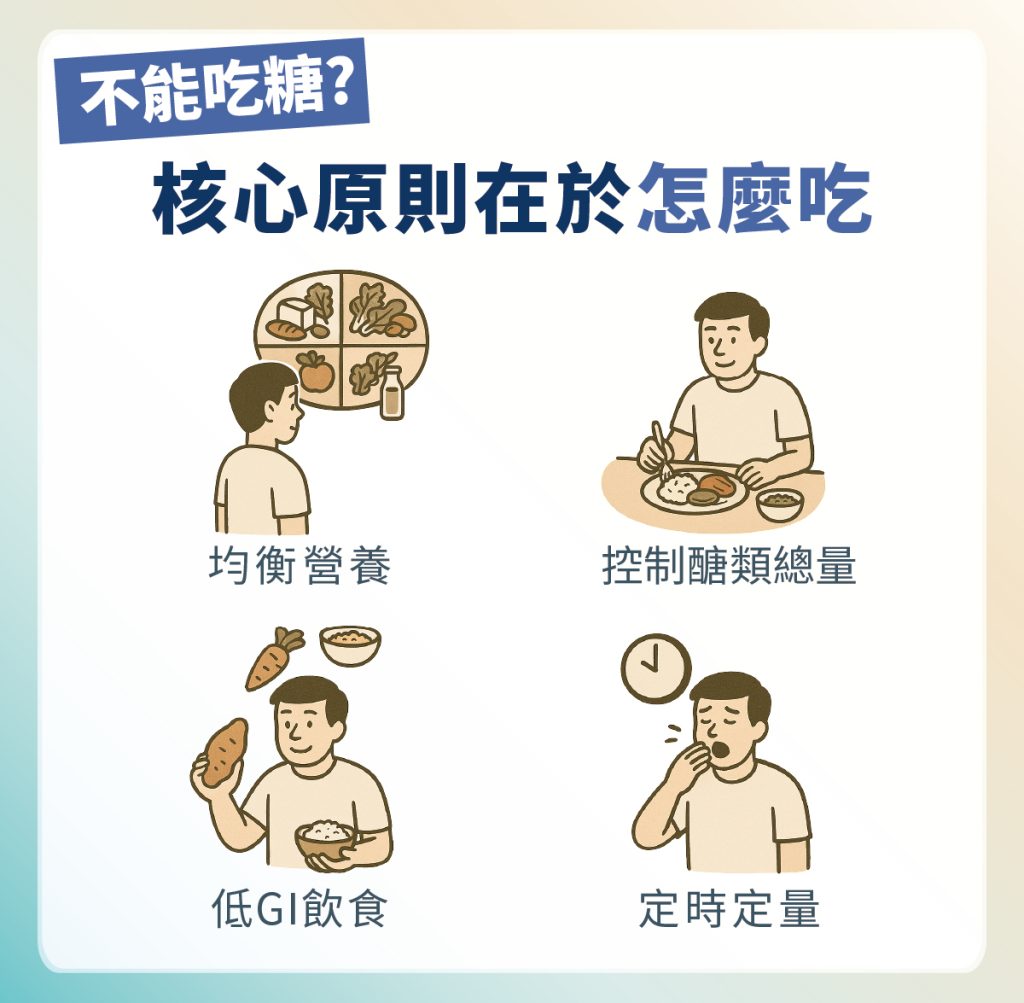 • 控制醣類總量:醣類是血糖上升的主要來源,糖尿病飲食要關注「吃多少」與「分配方式」,而不是一刀切斷,醣類是人體能量主要來源,完全不吃反而可能導致血糖過低或能量不足。