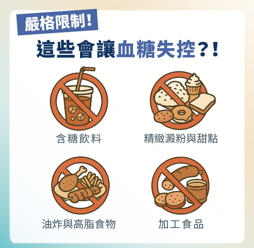 在糖尿病飲食中,有些食物會讓血糖快速飆升或增加身體負擔,需要避免或嚴格限制: