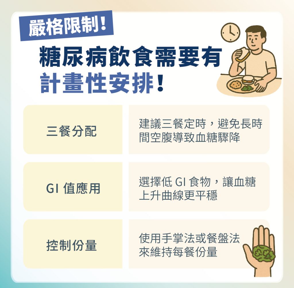 建議三餐定時,避免一次吃太多,可搭配少量健康點心,避免長時間空腹導致血糖驟降。