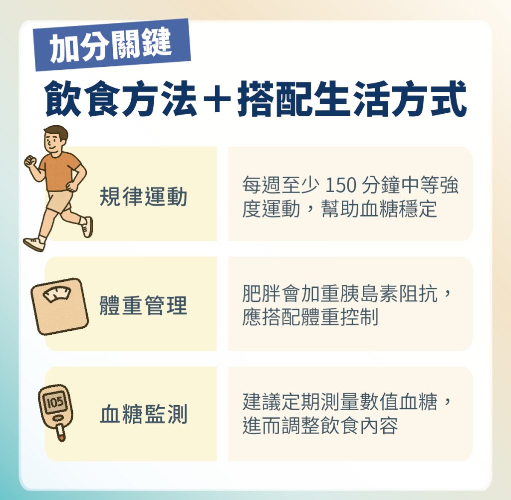 • 低 GI 飲食:選擇升糖指數(GI)較低的食物,例如糙米、燕麥、地瓜,讓血糖緩慢上升,避免血糖劇烈波動。